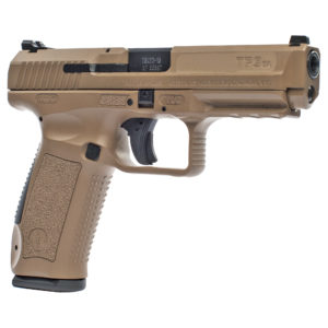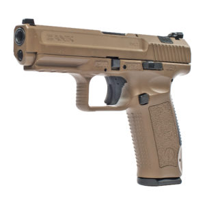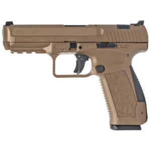 The CANIK TP9SA MOD2 features a loaded chamber indicator, match-grade barrel, reversible magazine release, and accessory rail.