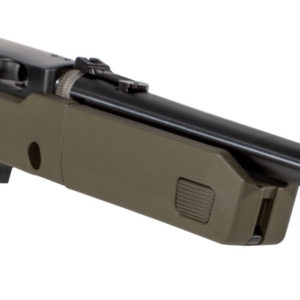 Ruger’s 10/22 Takedown features easy, quick separation of the barrel from the action for ease of transportation and storage. Simple reassembly allows for a secure connection of the barrel and action and returns the firearm to zero, even when receiver-mounted optics are used, ensuring consistent accuracy, shot after shot. The detachable 10-round rotary magazine features a unique rotor to separate cartridges and provide reliable feeding. The 10/22 has an easy-to-use extended magazine release that provides smooth, no-fuss removal of the flush-mounted magazine; push-button, cross-bolt manual safety; precision-rifled, cold hammer-forged barrel; fiber optic sights with an adjusdtable rear. The trigger housing assembly is precision-made of high-tech heat-stabilized, glass-filled, polymer for improved manufacturing tolerances, impact and abrasion-resistance, and unmatched ability to withstand the elements. This Takedown model features a Magpul Backpacker stock with an exclusive OD Green finish. It includes four 10-round BX-1 magazines (three in stock), and a combination scope base adapter for both Weaver-style and .22 tip-off scope mounts.